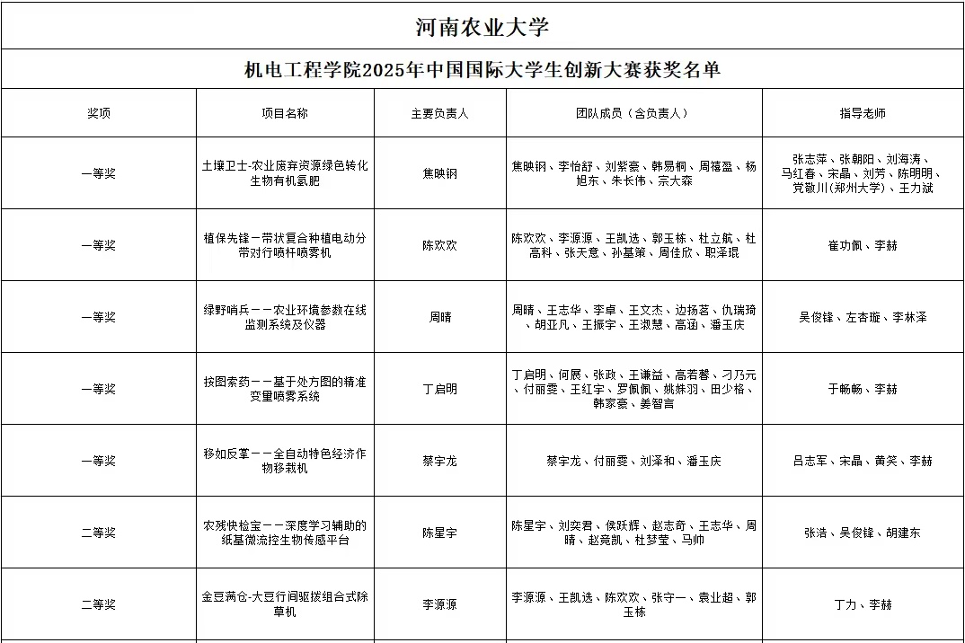 为贯彻落实党的二十大精神,立足新发展阶段、贯彻新发展理念、构建新发展格局、服务高质量发展,引导和激励大学生通过广泛的社会实践、深入的社会观察,不断增强对国情社情民情的了解,激发创新精神,培育创业意识,提升创业能力,同时营造良好的校园创新氛围,展示我院学子风采。我院广泛动员,积极组织开展了中国国际大学生创新大赛(2025)机电工程学院选拔赛,最终评选出一等奖5名,二等奖6名,三等奖4名。现将获奖名单公示如下: