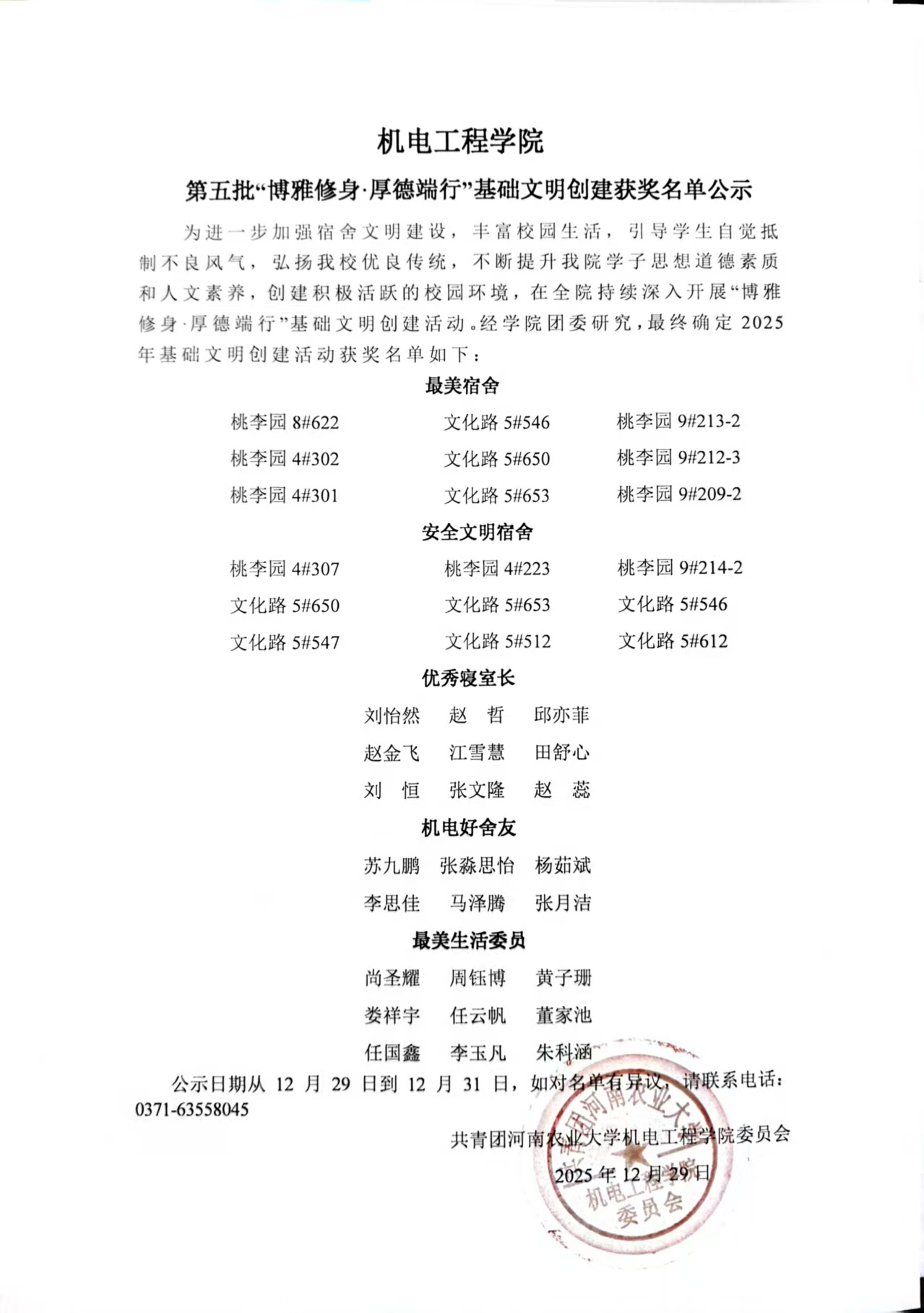 机电工程学院第五批“博雅修身·厚德端行”基础文明创建获奖名单公示