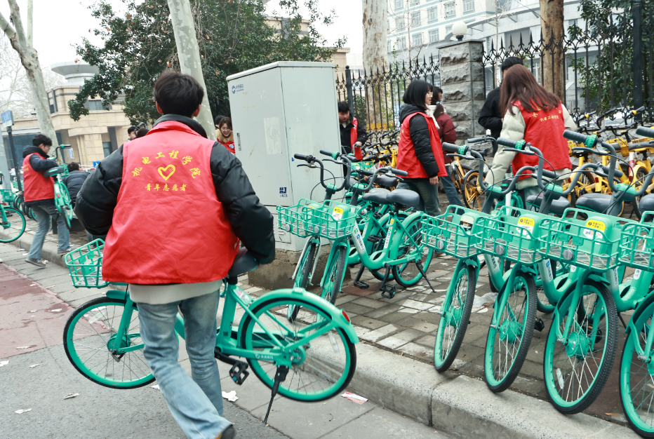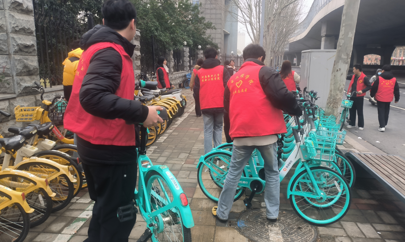 活动中,志愿者们迅速集结、分工协作,聚焦文化路校区北门人流密集、车辆停放杂乱的重点区域,对无序堆放、占道倒放的共享单车展开集中规整。大家默契协作,逐一扶正倒地车辆,耐心将错位、占道单车搬运至指定停放区域,认真对齐车身、规范摆放,让原本杂乱的停车区域焕然一新,通行道路更加顺畅。同时,志愿者主动向骑、停单车的同学宣传文明停放理念,引导大家自觉规范停车、爱护公共环境,让“文明共享、方便你我”的意识深入人心,文明的涟漪在校园不断扩散。