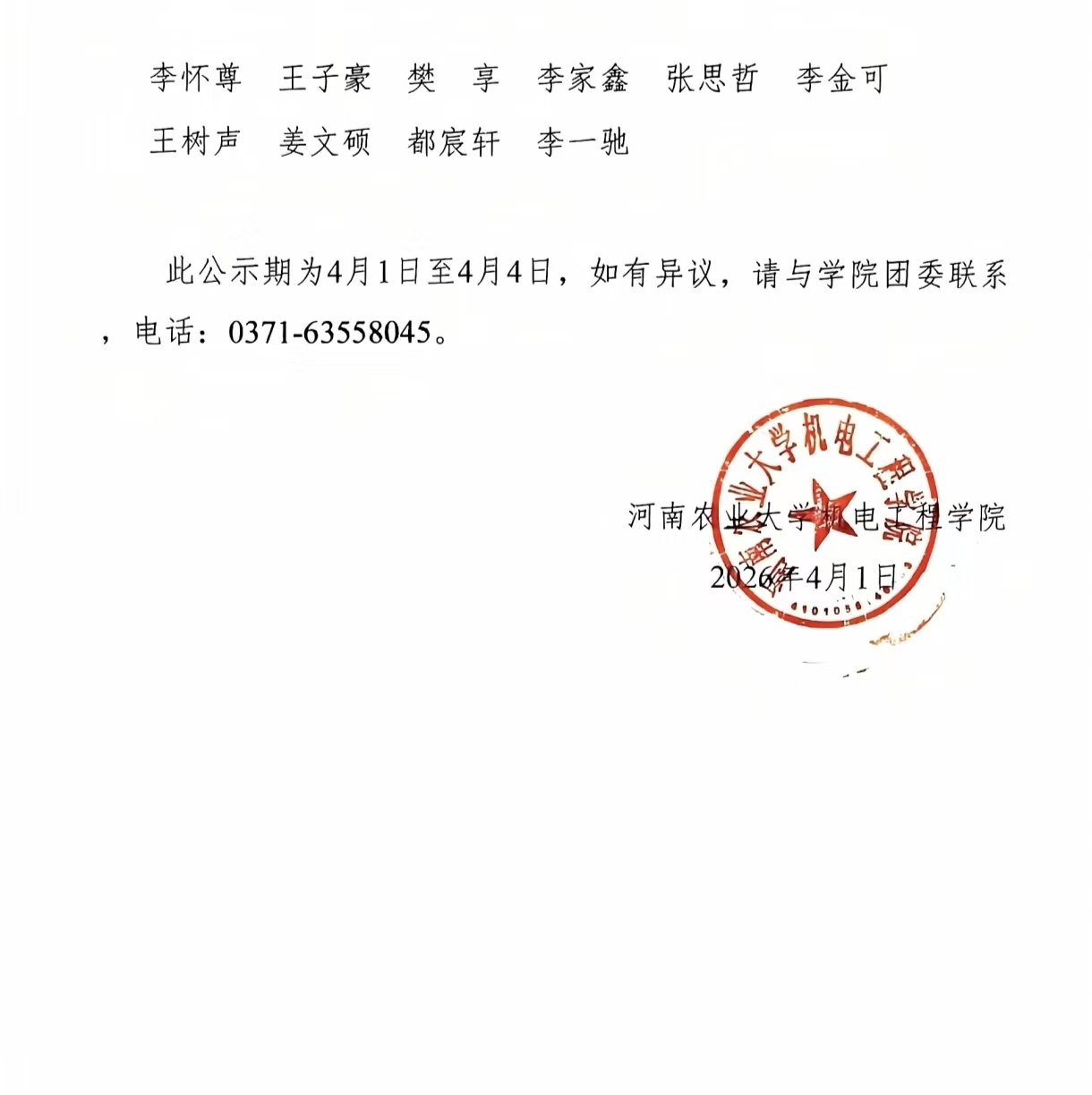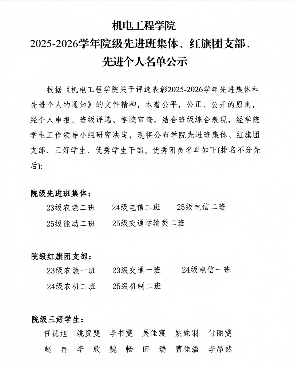 根据《机电工程学院关于评选表彰2025-2026学年先进集体和先进个人的通知》的文件精神,本着公平,公正、公开的原则,经个人申报、班级评选、学院审查,结合班级综合表现,经学院学生工作领导小组研究决定,现将公布学院先进班集体、红旗团支部、三好学生、优秀学生干部、优秀团员名单如下(排名不分先后):