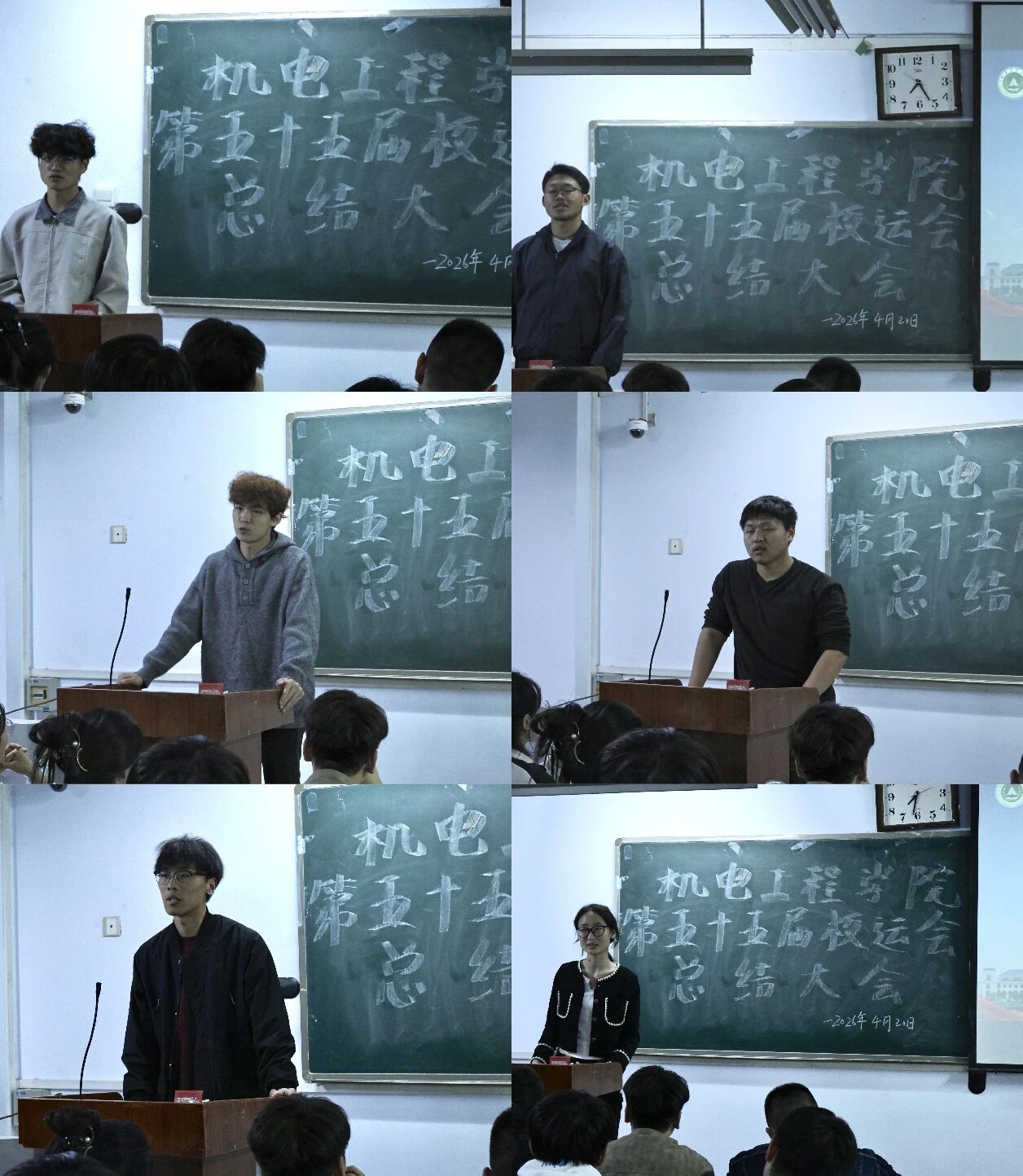 紧接着我院运动员中长组组长马飞海、跳组组长鲍奕臣、短跑组组长王源、三铁组组长汤仕显,及优秀运动员代表王金栋、高若馨依次发言。他们分享了赛前加练、挑战极限的经历与赛场上践行体育精神的感悟,向备战期间给予指导关怀的老师、提供贴心服务的志愿者及加油鼓劲的同学致谢,并期待下一届校运会再创佳绩、为学院争光。