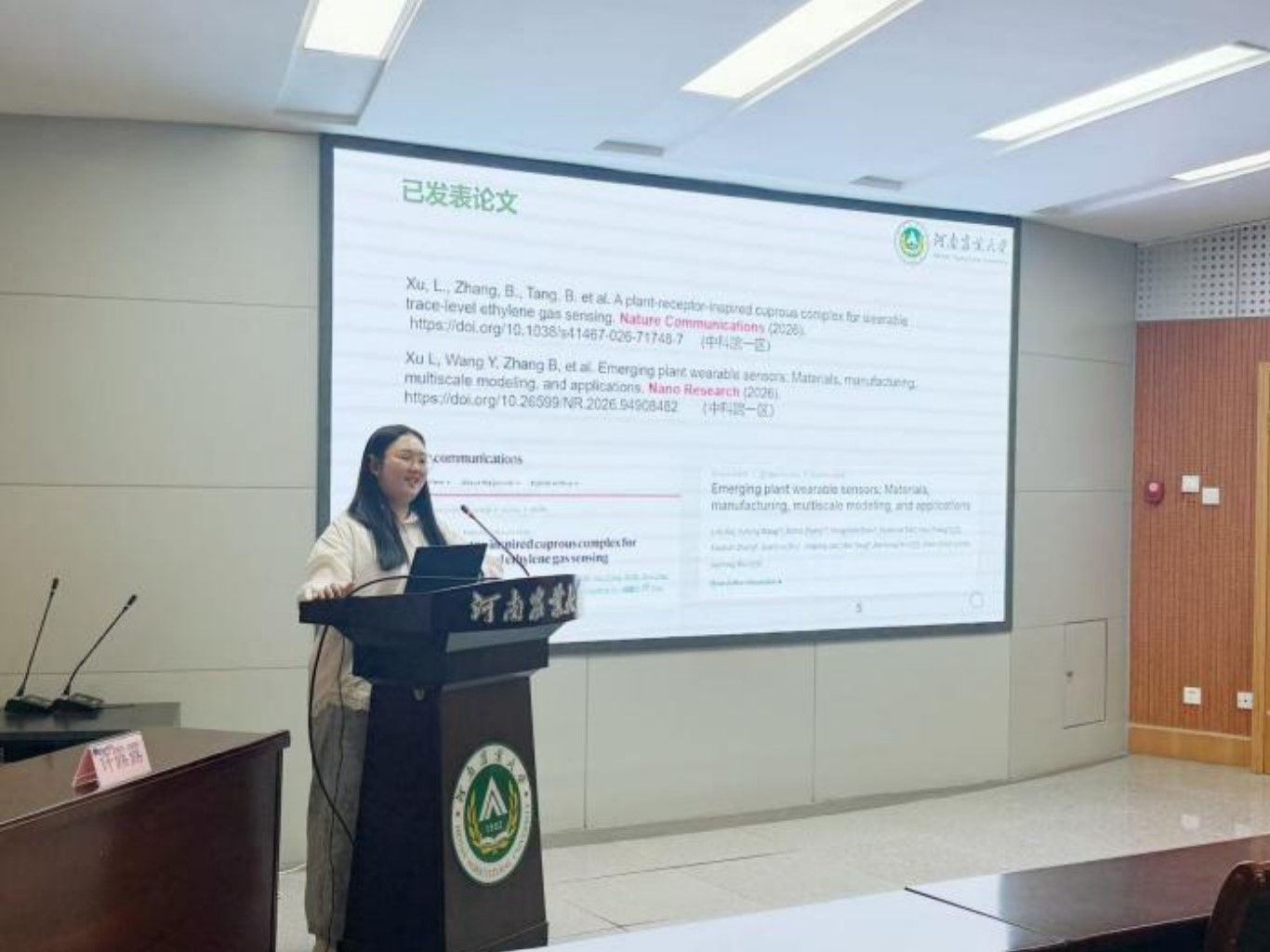 许露露,1996年10月生,机电工程学院在读博士,主要从事植物可穿戴传感器乙烯监测,目前,以第一作者在Nature Communications和Nano research发表SCI 2篇,并申请一项发明专利。